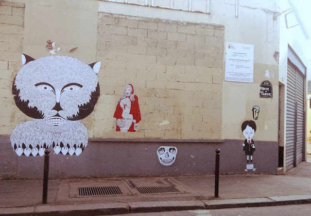 Pour terminer notre chevauchée fantastique sur les traces de Fred le Chevalier, attardons-nous quelques instants devant les êtres étranges qui s'accrochent becs et ongles sur le crépi des bâtiments de Ménilmontant. Nous trouvons, pêle-mêle, des écureuils, des chouettes (crucifiées sur les façades, comme pour éloigner le mauvais œil), des moutons, des chats (en bande, en scooter, dans l'herbe folle), des ânes qui rôdent la nuit, des hirondelles, des escargots, des tortues et des hippocampes que l'on chevauche sans vergogne, et tout un cheptel de mystérieuses bêtes à poils, cornes, sabots, écailles et carapace. Mais chut, n'en disons pas plus : à vous, à présent, de partir à la découverte de votre quartier !